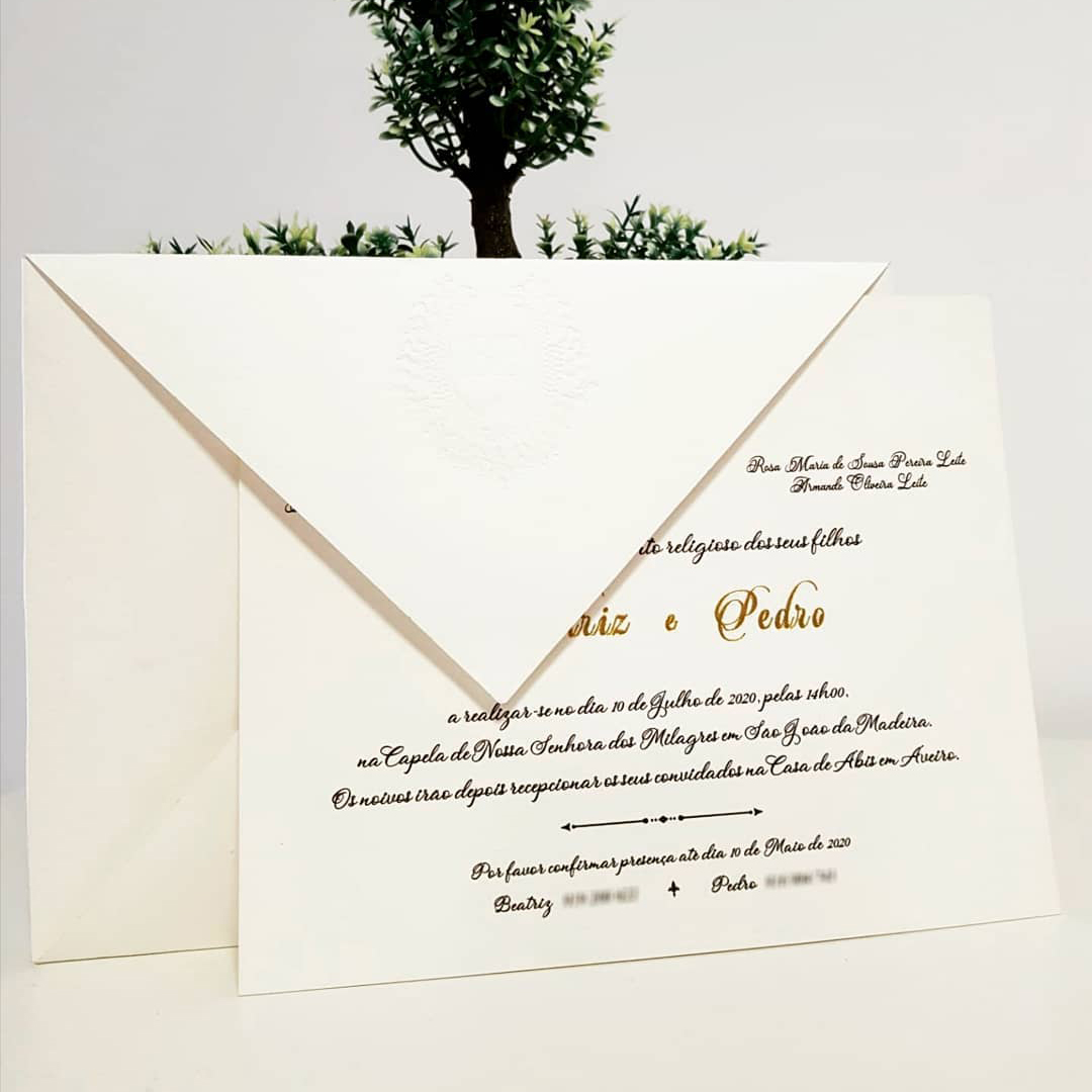 Convite e Envelope de Casamento Tradicional com Estampagem Ouro e Baixo Relevo. Formato Retangular Vertical. Orçamento de Moldes e Estampagens sob consulta.